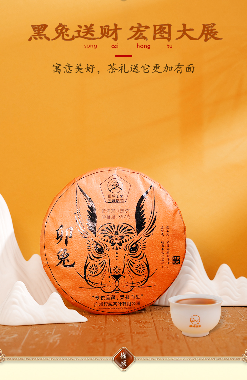權威茶葉此款【卯兔】生肖纪念饼,以“黑兔”为主题,代表着2023年癸水为黑,水为财的寓意,包装上采用了传统的剪纸元素,搭配金色&橙色的棉纸,与班章、易武的极霸极柔特色,融为一体,暗喻道家博大的阴阳哲理。